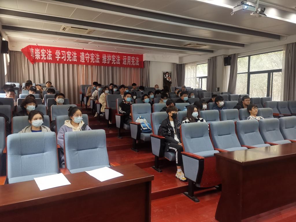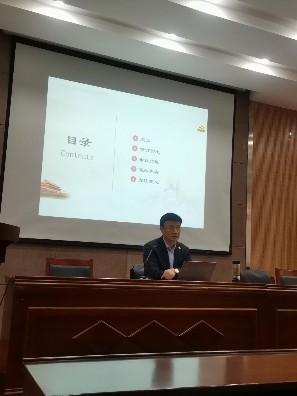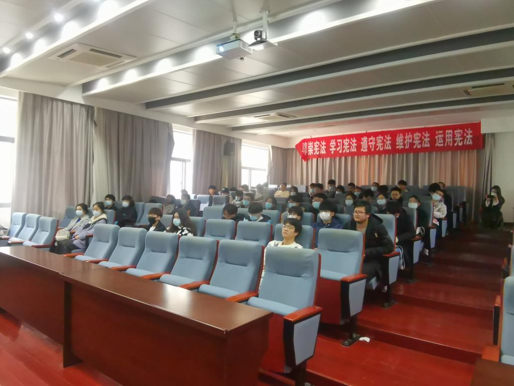 张广彩教授从宪法的定义入手,从宪法修订历史、宪法审议历程逐级展开,为现场的学生代表详细阐述了宪法的内容和宪法的意义。通过1个小时的聆听,同学们更加明确了宪法的重要地位,明确宪法是我国的根本大法,是治国安邦的总章程,是保持国家统一、民族团结、经济发展、社会进步和长治久安的法律基础,是中国共产党执政兴国、团结带领全国各族人民建设中国特色社会主义的法律保证;明确作为大学生应该知法懂法,身为学生干部,要为班级同学做好普法宣传工作。