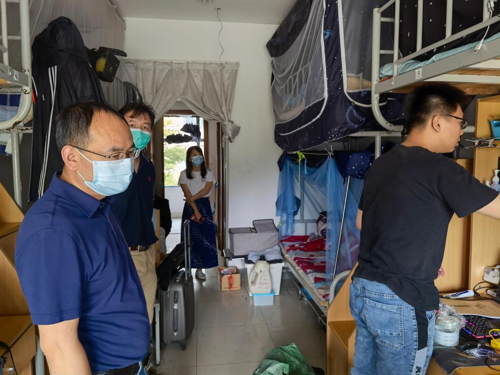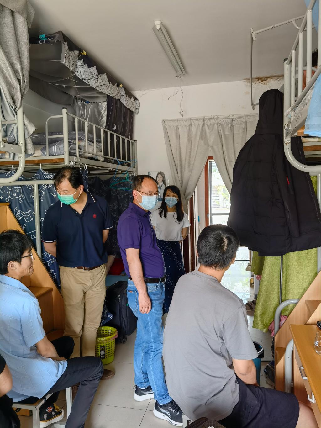 院领导详细了解了目前的宿舍环境和返校毕业生就业等情况。在关心毕业生的身体健康状况同时,询问了毕业生的返校生活状态,关注毕业生在就业及生活上遇到的困难。在走访过程中,院领导们叮嘱毕业生在特殊时期要勤洗手,自觉做好体温测量,出门全程佩戴口罩,就餐注意安全距离,每日做好宿舍的开窗通风、卫生清洁、消毒杀菌等工作。