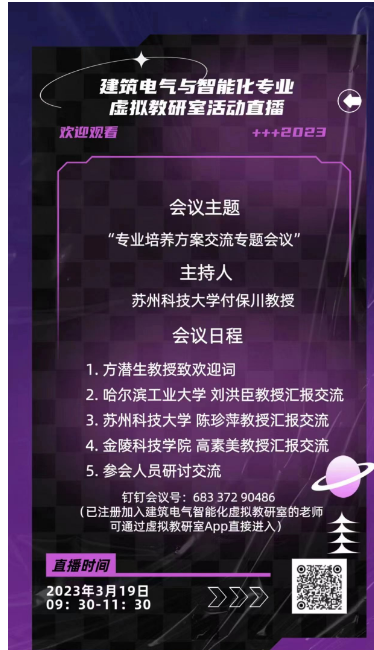 2023年3月19日上午,由我校组织的“建筑电气与智能化专业国家级虚拟教研室专业培养方案交流专题会议”,通过国家级虚拟教研室线上平台举行。