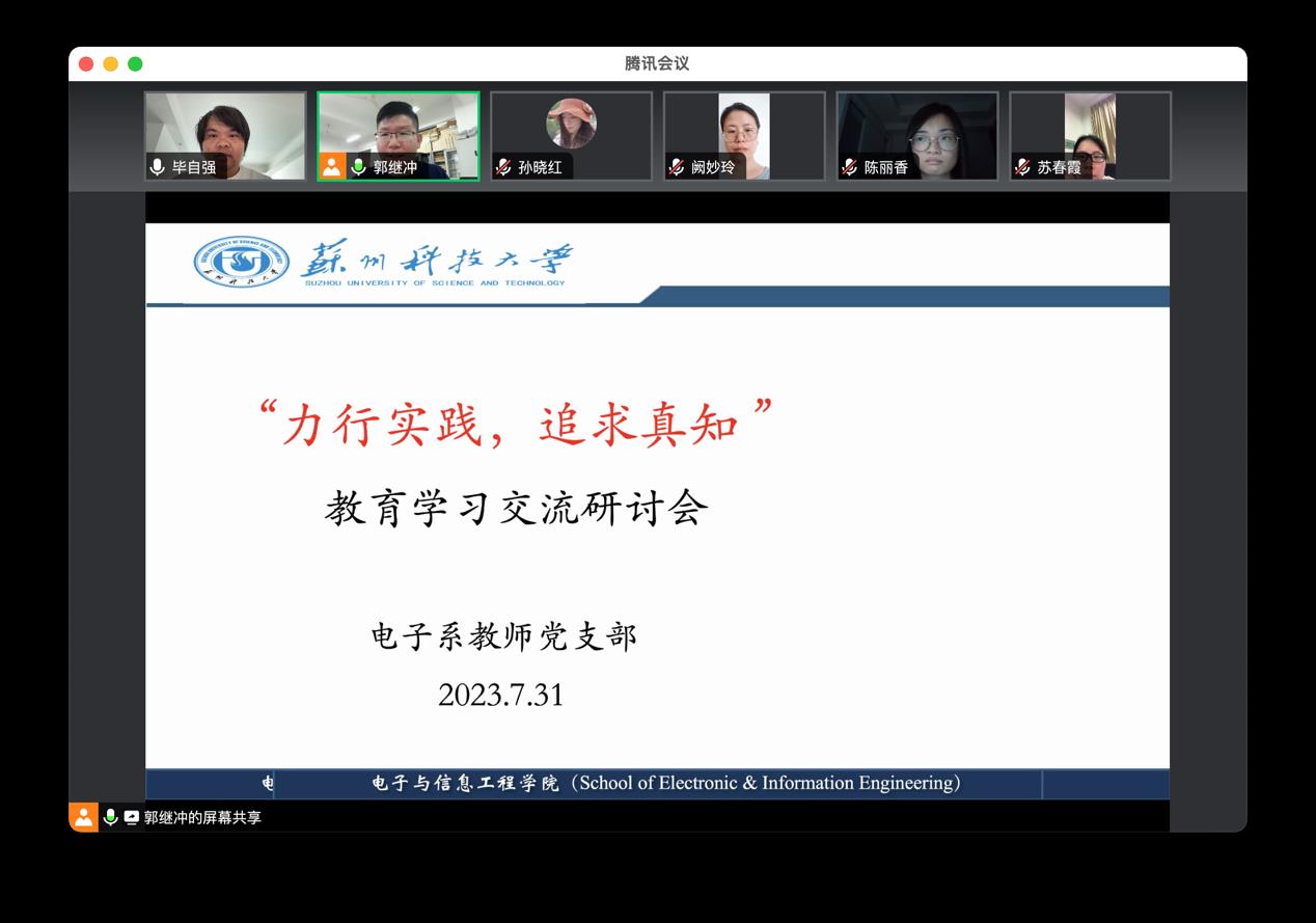 电子系教工党支部全体党员开展了“力行实践,追求真知”的主题教育学习及交流研讨,会议由支部书记郭继冲主持。