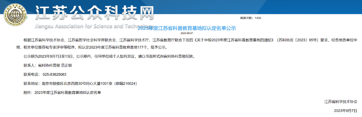 近日,江苏省科学技术协会下发了《关于申报2023年度江苏省科普教育基地的通知》,我校通博娱乐
