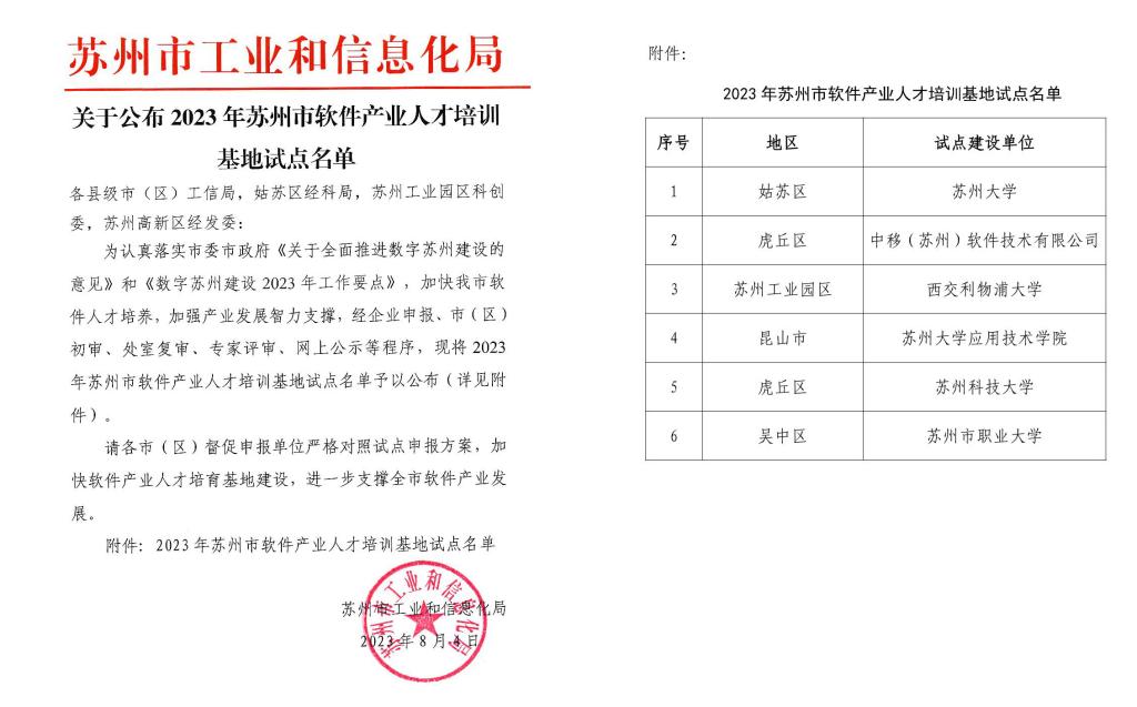 日前,苏州市工业与信息局公布了2023年苏州市软件产业人才培训基地试点名单,我校与苏州大学等6个单位获评入选。