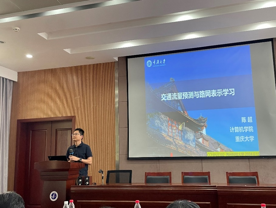最后,陈超做了题为《交通流量预测与路网表示学习》的学术报告,介绍所在团队在路网交通领域的理论研究、技术方法等方面的工作,围绕多变时空依赖下的交通流预测,多模式交通需求耦合下的联合预测,以及复杂语义下的路网表示学习等技术与师生进行了探讨。